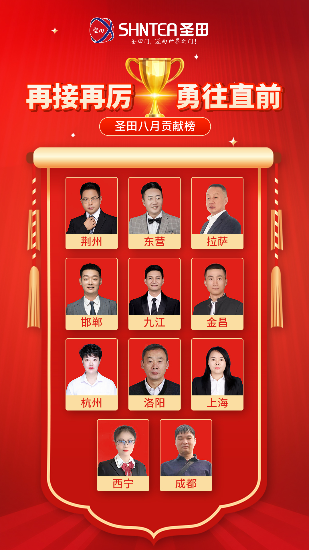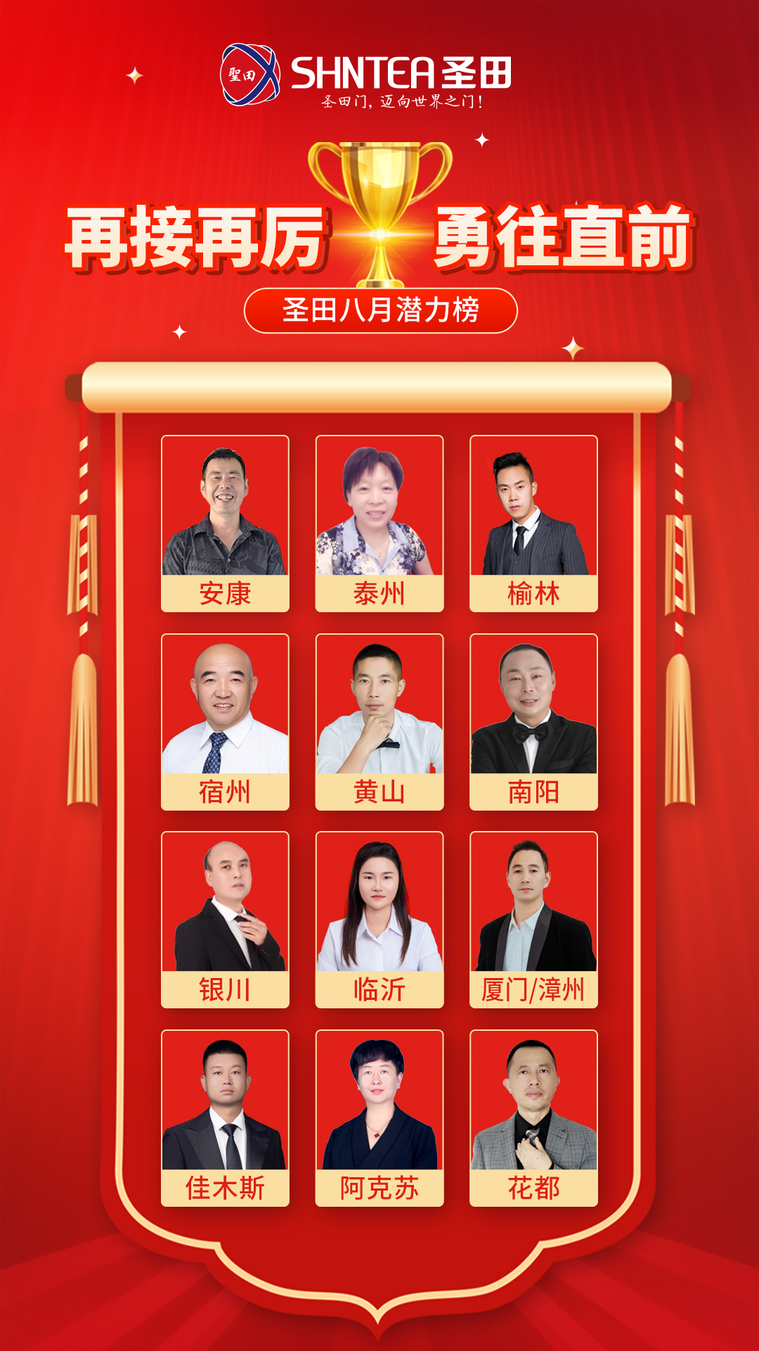 非你們莫屬 在我們璀璨的商業(yè)星空中,有這樣一群閃耀著格外奪目光芒的伙伴。“合肥圣田·肖永連、南京圣田·李如貴、徐州圣田·吳文學(xué)、西安圣田·吳強(qiáng)”你們就是當(dāng)之無愧的精英!